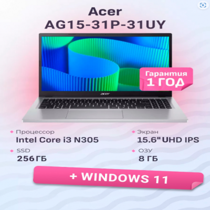 Qisqacha tavsif Noutbuk Acer/AG15-31P-31UY/Aspire Go 15/1g/Core i3/N305/1,8 GHz/8 Gb/PCIe NVMe SSD/256 Gb/ODD yo'q/Grafika/UHD/256 Mb/15,6 /1901x